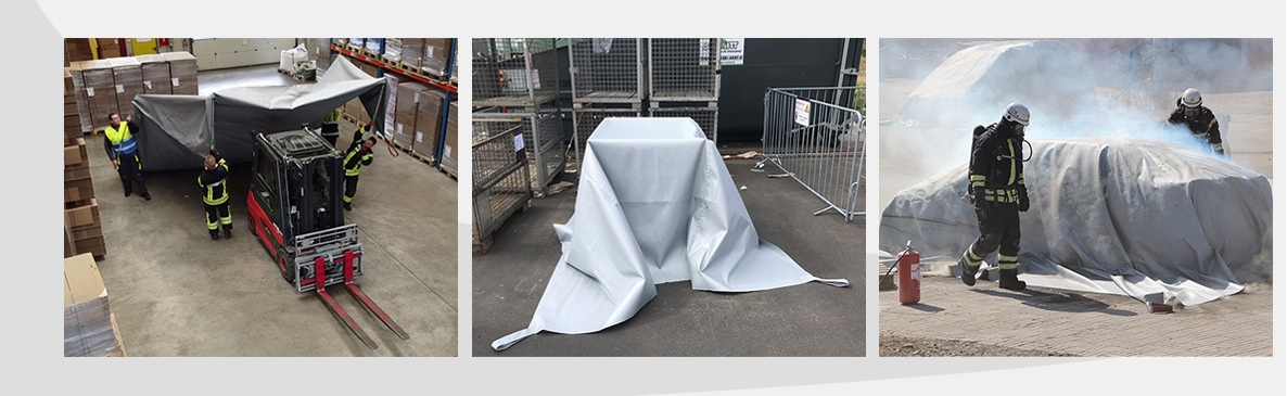Couvertures et sacs anti feu conçus pour résister aux incendies de batteries au Lithium. Modèles et dimensions à choisir selon vos appareils, véhicules, matériels et équipements électriques.